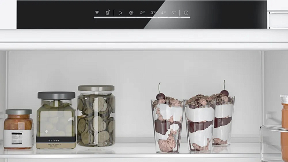 Управление реализовано по электронной схеме с сенсорными элементами и информативным дисплеем, что позволяет легко задать желаемые параметры одним прикосновением и отслеживать текущие показатели. Наличие звуковой индикации открытой двери помогает избежать потерь холода и повышенного энергопотребления, предупреждая пользователя о неплотном закрытии. Функция «Отпуск» предназначена для длительного отсутствия: она поддерживает оптимальные условия для хранения, снижая расход электроэнергии и предотвращая развитие неприятных запахов в пустой камере.