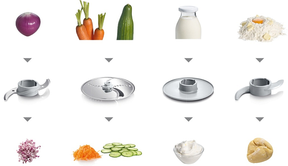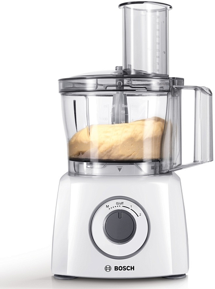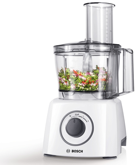 Кухонный комбайн MCM3100W — компактная и функциональная модель от Bosch. Разнообразие насадок позволяет измельчать, шинковать или тереть продукты.