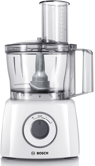 Кухонный комбайн MCM3100W — компактная и функциональная модель от Bosch. Разнообразие насадок позволяет измельчать, шинковать или тереть продукты. Простое и понятное управление повышает комфорт использования. Две скорости и импульсивный режим расширяют возможности модели. Все пластиковые части абсолютно безопасны для продуктов питания.