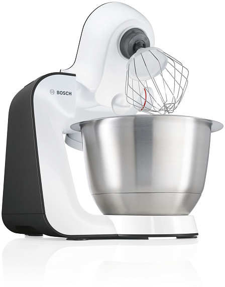 Кухонный комбайн Bosch MUM 54A00 оборудован большой чашей объемом 3.9 литров, которая позволяет замесить до 2 кг плотного теста. Функция автоматической парковки фиксирует насадки в удобном положении для снятия. Венчики и крюк для теста можно положить в специальную сумку.