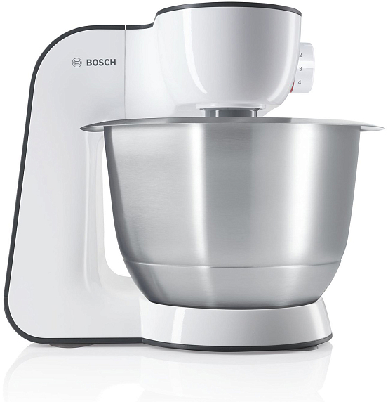 Кухонный комбайн Bosch MUM 54A00 оборудован большой чашей объемом 3.9 литров, которая позволяет замесить до 2 кг плотного теста.