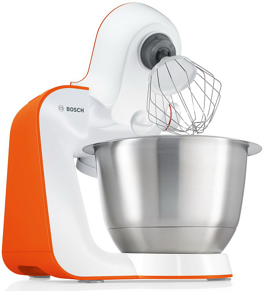 Кухонный комбайн Bosch MUM 54I00 оснащен большой чашей из нержавеющей стали для замешивания теста, быстрого взбивания крема и сливок. Объем чаши 3,9л позволяет замесить до 2 кг плотного теста. В комплекте — два венчика и крюк для теста, для их хранения предусмотрена небольшая сумка, которая хранится в чаше комбайна.