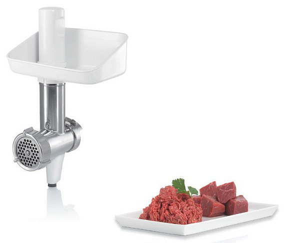 В комплекте есть всё необходимое для приготовления разных блюд: венчик, крюк, двусторонняя терка, двусторонняя шинковка, терка для сыра,орехов,шоколада, диск для картофеля фри, а также мясорубка.