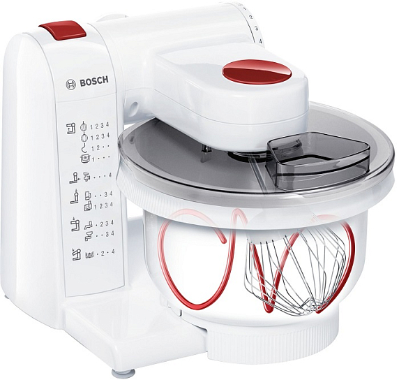 Кухонный комбайн Bosch MUMP1000 оснащен большой пластиковой чашей объемом 3.9 л (позволяет замешивать до 2 кг теста), венчиком для взбивания, насадкой для взбивания жидкого теста и крюком для замешивания крутого текста.