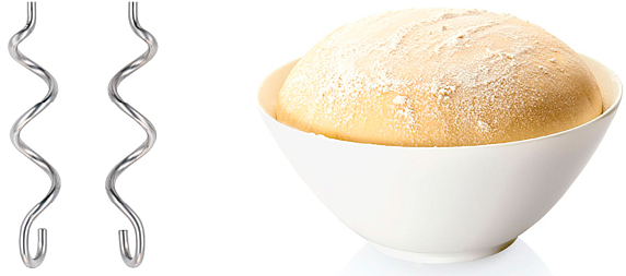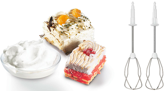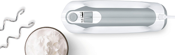 <p>Выполнен в сочетании серого и белого цвета. Имеет 5 скоростей и дополнительный турборежим. В комплекте идут 4 насадки: 2 венчика для взбивания и 2 крючка для замешивания теста. </p>