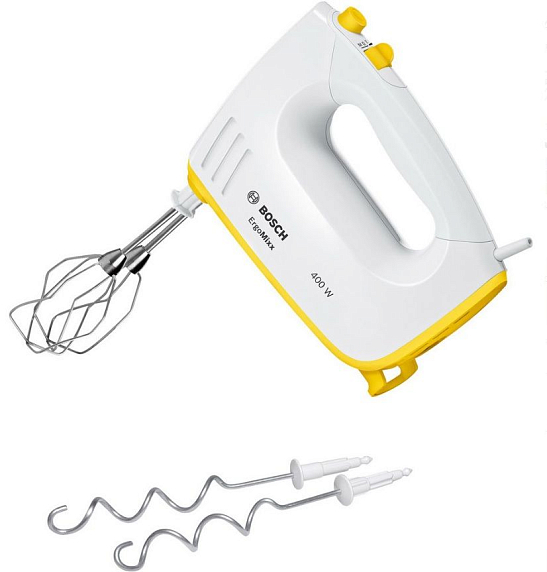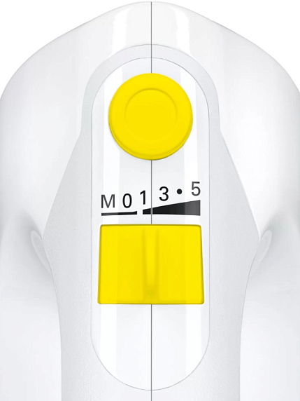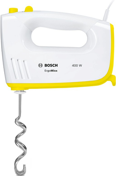 Миксер Bosch MFQ36300Y с эргономичным дизайном ручки представлен в белом цвете с желтыми элементами на корпусе.