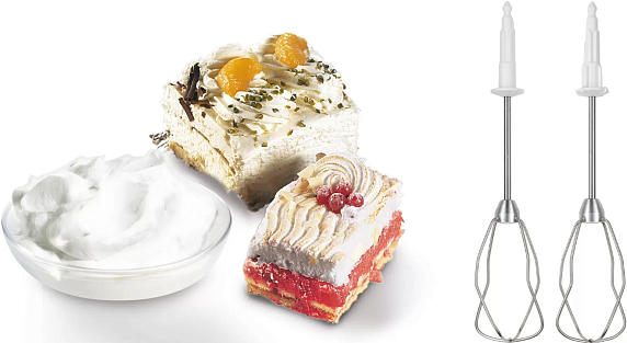 В модели имеется 5 режимов скоростей, а также турборежим с плавным стартом. Это позволяет выбрать оптимальную скорость для приготовления. Конструкция миксера позволяет легко смешивать и взбивать продукты одной рукой. В комплекте поставляются две пары венчиков, два крюка для теста.