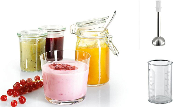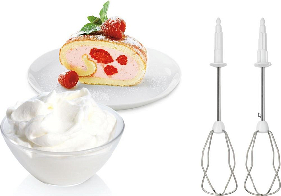 Миксер Bosch MFQ36470 оснащен венчиками для взбивания и крюками для замешивания теста, насадка-блендер поможет быстро и качественно измельчить продукты