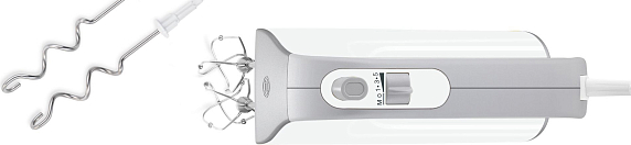 Миксер Bosch MFQ 4030 белого цвета — дизайнерская модель необычной формы. Специальные резиновые вставки на ручке предотвращают скольжение, прибор удобно держать. Два высокоэффективных венчика Finecreamer и два крюка выполнены из нержавеющей стали. Возможно присоединение насадки-блендера.