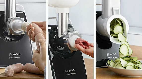Мясорубка Bosch MFW 3640A CompactPower — многофункциональный прибор с насадками для шинкования овощей, приготовления фарша, колбас и кеббов. Высокая производительность 1.9 кг/мин и надежность прибора сочетается с компактными размерами. При функции реверс появляется возможность провернуть шнек в обратном направлении для очистки.