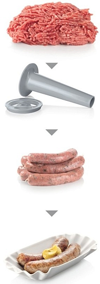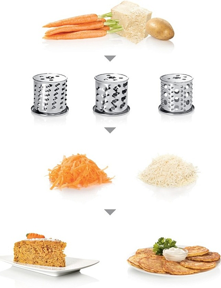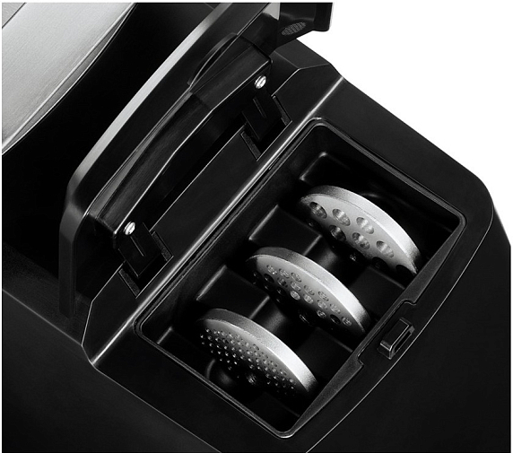 Мясорубка оснащена десятью насадками, включая формовочные диски для фарша различных размеров (3, 4.8, 8 мм), насадку для приготовления колбас и кеббе, а также пресс для отжима сока. В комплекте 4 барабана: три терки и одна шинковка. Благодаря большому загрузочному лотку и универсальному толкателю, использование устройства становится максимально удобным. Для удобства переноса предусмотрена ручка. Все насадки можно хранить в специальном отсеке, что обеспечивает порядок и экономию пространства.