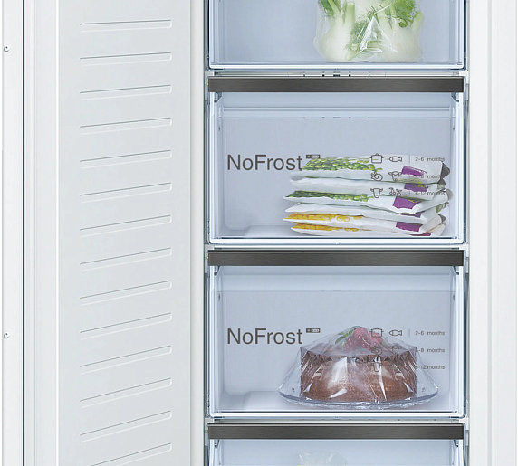 Встраиваемая морозильная камера Bosch GIN81HNE0 сочетает лаконичный внешний вид и точные инженерные решения, позволяющие интегрировать прибор в кухонный гарнитур высотой от 177,2 до 178 см. Корпус и фасад выполнены в светлом тоне, что упрощает визуальное сочетание с мебелью: внешние габариты — высота 177,2 см, ширина 55,8 см, глубина 54,5 см, а параметры ниши для монтажа — 177,2–178 х 56 х 55–56 см; эти показатели дают установщику уверенность в быстрой и аккуратной подгонке. Внутреннее пространство предлагает полезный объём 212 литров, организованный с учётом удобства хранения: пять вместительных ящиков, включая отдельный BigBox для крупных упаковок, и две зоны быстрого замораживания для свежих заготовок. Форма для приготовления кубиков льда входит в комплект, что добавляет практичности для быта и приёмов гостей.
