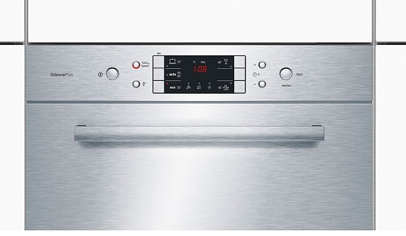 Дисплей в посудомоечной машине расположен вверху фронтальной части и помогает с настройками, а также в коммуникации с устройством. Отображение текста представлено двумя строками с шестью символами в каждой.