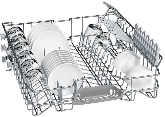 Два короба Vario вмещают 12 комплектов посуды. В нижнем коробе находятся складывающиеся направляющие для тарелок. В верхнем коробе — специальные полочки для чашек. Система защиты стекла позволяет без опасений мыть стаканы, бокалы и фужеры.