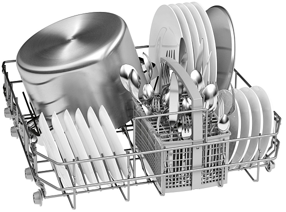 Посудомоечная машина Bosch SMV 45CX00R — встраиваемая модель, которая вмещает 13 стандартных комплектов посуды. Переставляемый по высоте верхний короб позволит разместить в нижней корзине большие кастрюли и противни. Для тарелок и чашек предусмотрены специальные направляющие.