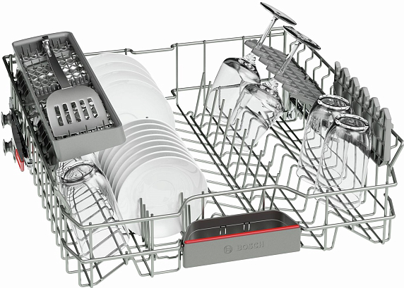 Встраиваемая посудомоечная машина Bosch SMV 45IX00R рассчитана на 13 стандартных комплектов посуды. Особенность модели — переставляемый по высоте верхний короб Rackmatic-3. Если вам нужно место в нижнем коробе для противня или большой кастрюли, то вы сможете легко поднять верхний лоток, даже если он полностью загружен.