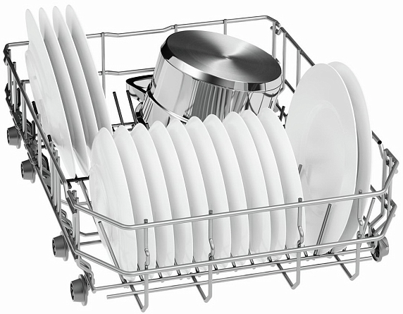 Переставляемый по высоте верхний короб системы Rackmatic и Rackmatic-3 создан для размещения габаритной посуды в нижней корзине посудомоечных машин. Чтобы правильно уложить высокие кастрюли можно поднять верхний короб даже при его полной загрузке на 5 см. Обычно этой высоты вполне хватает для нестандартной посуды. При этом качество мытья останется таким же хорошим.