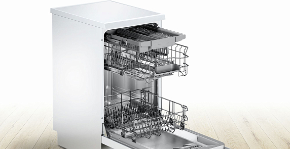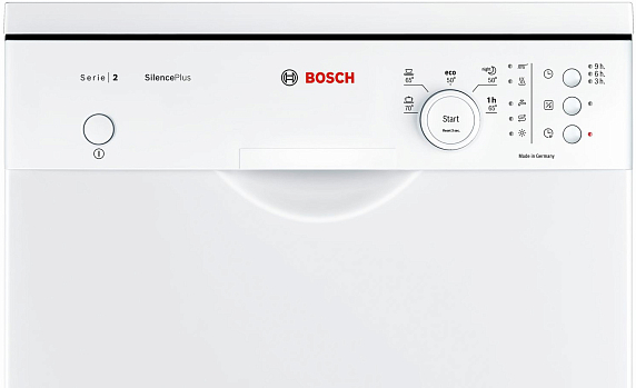 Посудомоечная машина Bosch SPS25FW13R — узкая отдельностоящая модель с пятью программами, специальным режимом VarioSpeed и половинной загрузкой. Третий уровень загрузки VarioDrawer заменяет корзину для столовых приборов. Система регулировки высоты верхнего короба Rackmatic-3 позволяет размещать внизу большие кастрюли и противни.