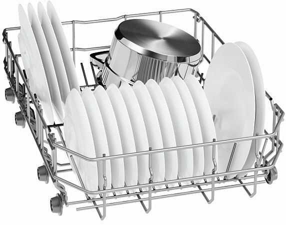 Переставляемый по высоте верхний короб системы Rackmatic и Rackmatic-3 создан для размещения габаритной посуды в нижней корзине посудомоечных машин. Чтобы правильно уложить высокие кастрюли можно поднять верхний короб даже при его полной загрузке на 5 см. Обычно этой высоты вполне хватает для нестандартной посуды. При этом качество мытья останется таким же хорошим.
