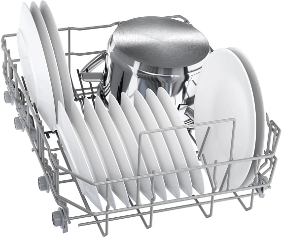 Посудомоечная машина Bosch SPS4HMI64Q из нержавеющей стали с чёрной панелью управления подчёркивает премиальную эстеттику и отлично вписывается в современную кухню; узкий формат шириной 45 см делает оборудование идеальным решением для компактных помещений, сохраняющим вместимость до 10 комплектов посуды. Отдельностоящий формат упрощает монтаж и даёт свободу планировки, а высота 84,5 см и глубина 60 см обеспечивают совместимость с большинством столешниц. Внутреннее пространство выполнено из нержавеющей стали, что повышает долговечность и устойчивость к агрессивным моющим средствам, дополнительно защищено возможностью гарантийной защиты от сквозной коррозии моечной камеры на срок 10 лет.