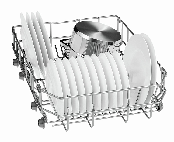 Переставляемый по высоте верхний короб системы Rackmatic и Rackmatic-3 создан для размещения габаритной посуды в нижней корзине посудомоечных машин. Чтобы правильно уложить высокие кастрюли можно поднять верхний короб даже при его полной загрузке на 5 см. Обычно этой высоты вполне хватает для нестандартной посуды. При этом качество мытья останется таким же хорошим.