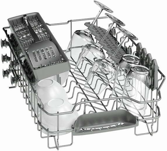 Посудомоечная машина Bosch SPV45DX00R — встраиваемая модель с 5 программами мытья и защитой от протечек Aquastop. Регулируемый по высоте верхний короб позволяет разместить в нижнем ящике противни и большие кастрюли. Специальная функция Intensive Zone обеспечивает превосходные результаты при одновременной загрузке сильно загрязненной посуды на нижний уровень и хрупких бокалов наверх. Вода в интенсивную зону подается под давлением, что гарантирует сохранность стекла и чистоту кастрюль и тарелок.