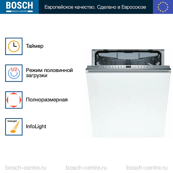** Все информационные материалы, представленные на Сайте, носят справочный характер и не могут в полной мере передавать достоверную информацию о свойствах, комплектации и характеристиках товара, включая цвета, размеры и формы. Фирма-производитель оставляет за собой право на внесение изменений в конструкцию, дизайн и комплектацию товара без предварительного уведомления. Перед оформлением Заказа Покупатель должен обратиться к Продавцу для уточнения свойств и характеристик Товара. Подробная информация о товаре указывается в инструкции и на упаковке товара. Используемое название в России: Бош SMV46KX55E