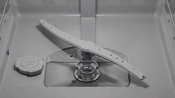 Внутреннее пространство организовано с прицелом на гибкость размещения столовых приборов: три корзины, верхний короб с двумя полочками для чашек и система Rackmatic-3 для регулировки высоты обеспечивают удобство загрузки разнообразной посуды. Направляющие для тарелок включают два складных элемента в верхнем модуле и четыре — в нижнем, что даёт возможность быстро трансформировать внутреннее пространство под крупные кастрюли или хрупкую посуду. Материал бака — сочетание нержавеющей стали и пластика — гарантирует сочетание долговечности и лёгкости, а также стабильность температурного режима при разных режимах работы.