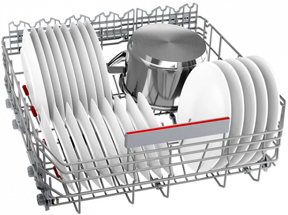 Переставляемый по высоте верхний короб системы Rackmatic и Rackmatic-3 создан для размещения габаритной посуды в нижней корзине посудомоечных машин. Чтобы правильно уложить высокие кастрюли можно поднять верхний короб даже при его полной загрузке на 5 см. Обычно этой высоты вполне хватает для нестандартной посуды. При этом качество мытья останется таким же хорошим.