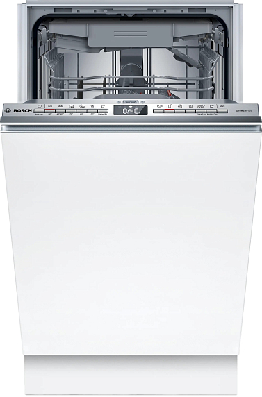 Встраиваемая посудомоечная машина Bosch SPV4EMX17E имеет чёрную панель управления, аккуратно скрытую за фасадом для создания цельного вида кухни. Корпус рассчитан на установку в нишу высотой 81.5–87.5 см, шириной 45 см и глубиной 55 см, что обеспечивает совместимость с большинством стандартных шкафов. Компактная глубина 55 см вместе с шириной 44.8 см делает прибор удобным для небольших, но продуманных зон приготовления пищи. Внутреннее оформление сочетает нержавеющую сталь и пластик, что гарантирует устойчивость к коррозии, а также оснащено 10-летней гарантией от сквозной коррозии моечной камеры — серьёзный аргумент в пользу долговечности.
