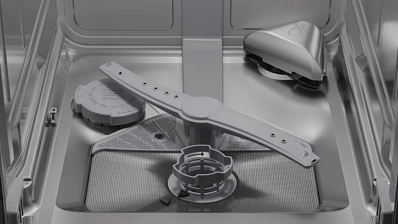 Практичность управления пространством представлена тремя корзинами, верхняя из которых регулируется по высоте с помощью системы Rackmatic-3; в верхнем ящике размещена полочка для чашек, а складывающиеся направляющие в верхней и нижней корзинах (соответственно три и четыре секции) позволяют адаптировать расположение тарелок и кастрюль. Самоочищающаяся фильтрация облегчает уход, сенсор чистоты воды AquaSensor анализирует уровень загрязнений и корректирует цикл для экономии ресурсов, а проточный нагревательный элемент гарантирует стабильный нагрев без дополнительных резервуаров.