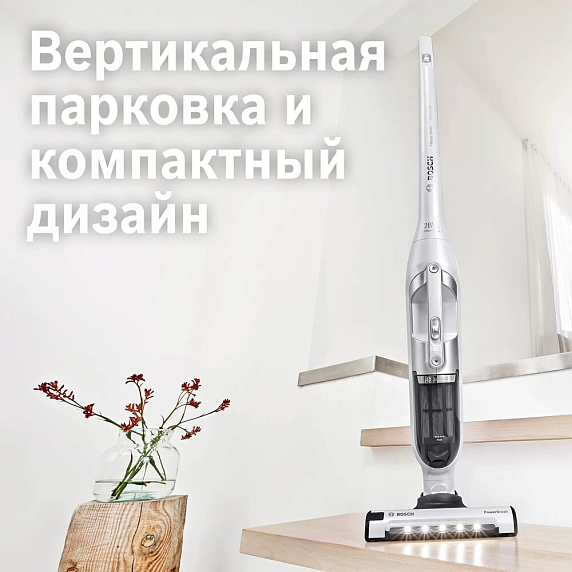 Пылесос Bosch BBH3ALL28 — это удобная модель в эксплуатации, выполненная в черно-серебристом цвете. Она не займет у вас много места в помещении, поскольку ее габариты небольшие: высота — 115 см, ширина — 26,5 см, глубина — 18 см. Это вертикальная техника, обладающая сухим типом уборки. Аккумулятор может работать от Li-ion или Ni-Mh элементов питания до 60 минут. За это время вы легко сможете сделать легкую и быструю, но при этом качественную уборку. Модель удобна лежит в руке, поэтому не стоит переживать о неудобстве. Время подзарядки — до 5 часов (100% заряда).