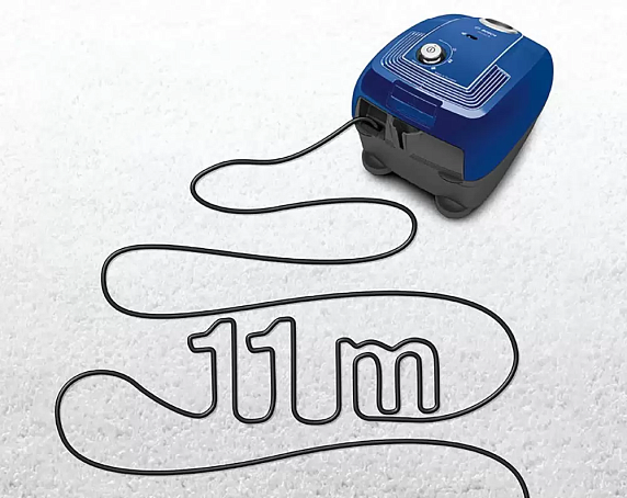 Насадки позволяют эффективно убирать различные поверхности и материалы. Четыре подвижных ролика, что обеспечивает его легкую маневренность. Автосматывание сетевого шнура делает его использование еще более удобным. Радиус действия пылесоса составляет 11 метров, что позволяет убирать большие площади без необходимости переключения розеток. Устройство работает от надежного и долговечного мотора, потребляющего 2200 Вт. Уровень шума при работе составляет 80 дБ, что является допустимым значением для бытовых пылесосов. Он работает от сети напряжением 220-240 В и частотой 50-60 Гц. Длина сетевого кабеля составляет 7 метров, что обеспечивает большую свободу действий при уборке.