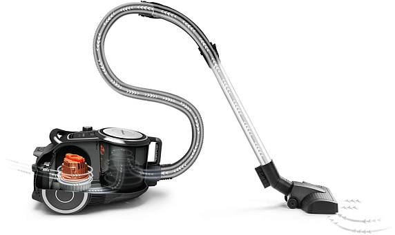 Устройство оснащено электронной регулировкой мощности с поворотным регулятором, расположенным на корпусе. Это позволяет точно подобрать оптимальную мощность для различных типов поверхностей и уровней загрязнения. Кроме того, пылесос имеет автосматывание сетевого шнура и встроенный отсек для хранения насадок, что обеспечивает удобство хранения и транспортировки устройства. В комплекте с пылесосом идут различные насадки, включая насадку для пола и ковра, щелевую насадку и насадку для мягкой мебели. Это позволяет эффективно убирать любые поверхности, удаляя даже самые труднодоступные загрязнения. Также есть функция легкой очистки щетки Easy Clean, что облегчает уход за устройством. Сетевой кабель длиной 7 метров позволяет убирать большие помещения без необходимости переключения розеток.