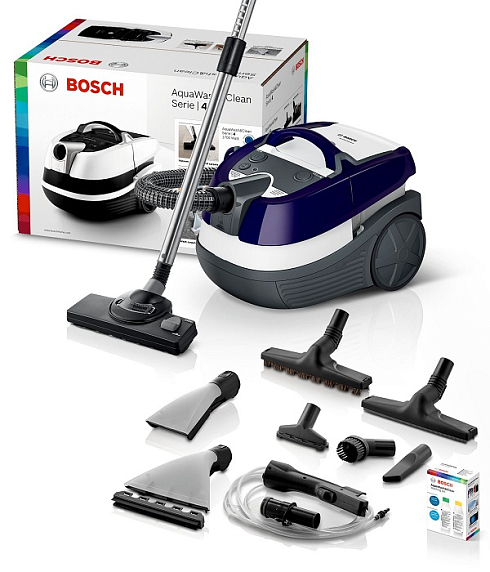Пылесос Bosch BWD41740 подойдёт тем, кто ценит собственный комфорт, а также внешне привлекательную технику. Прибор принадлежит комфортабельной линейке AquaWash&Clean. Как понятно из названия, с помощью устройства можно не только чистить ковры, но и мыть полы. Фиолетовый удачно сочетается с белым и серым, встречающихся в цвете корпуса.