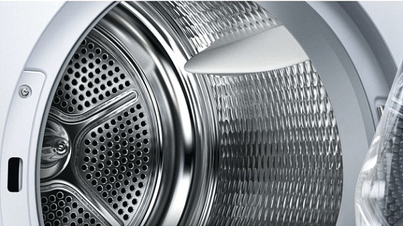 Сушильная машина оснащена барабаном SoftDry, изготовленным из нержавеющей стали, что обеспечивает долговечность и надежность при использовании. Дополнительное оснащение барабана LED подсветкой упрощает процесс загрузки и выгрузки белья, особенно в условиях плохого освещения. Двигатель с инверторным управлением обеспечивает плавный ход и уменьшает уровень шума при работе. Присутствует контейнер для конденсата, что упрощает обслуживание и улучшает качество сушки белья. Ворсовый фильтр эффективно улавливает мелкие частицы и волокна, обеспечивая чистоту белья после сушки. Дверца навешивается справа, что удобно для большинства пользователей.