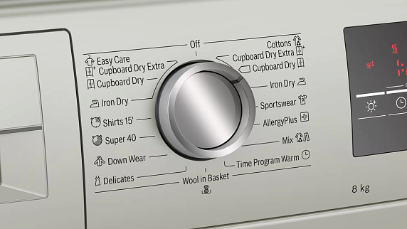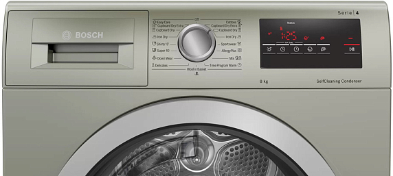 Сушильная машина Bosch WTN8543SME имеет технологию AntiVibration Design — это специальные боковые стенки созданные для устойчивости и подавления вибрации, а также шума. Есть программа быстрой сушки, она высушит белья за 15 мин. На LED-дисплее отображается время до окончании программы.