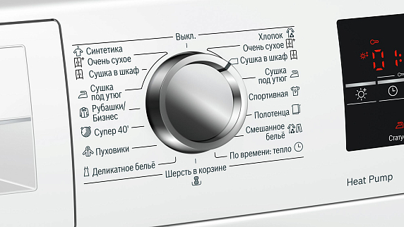 - К конденсационной сушке добавился тепловой насос, поэтому влажность выводится в специальный контейнер или сразу в канализацию, а горячий воздух используется повторно. Пользователю не нужно прокладывать магистраль к вентиляции.