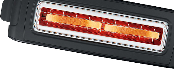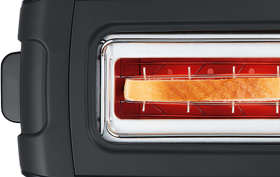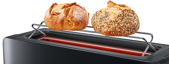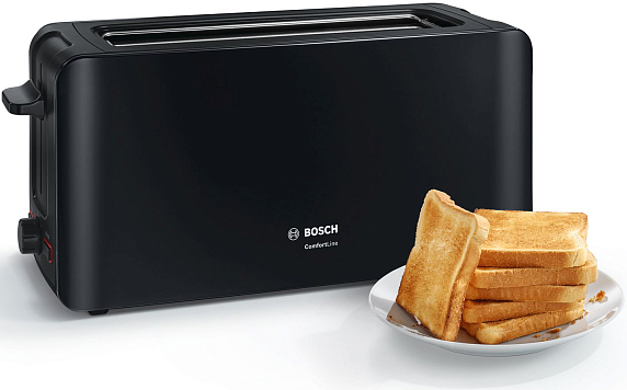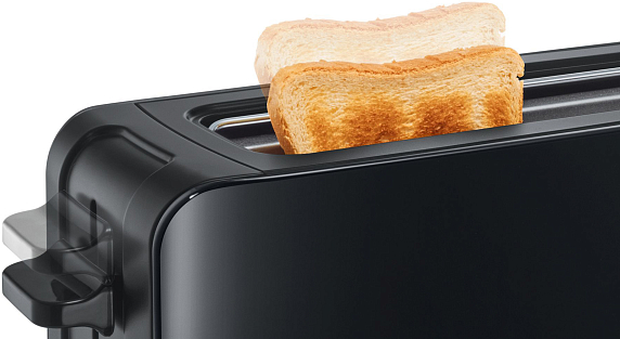 Тостер Bosch TAT6A003 черного цвета отличается удлиненным размером слота, благодаря которому удобно подогревать большие куски хлеба или одновременно два стандартных тоста.