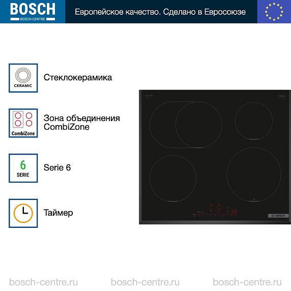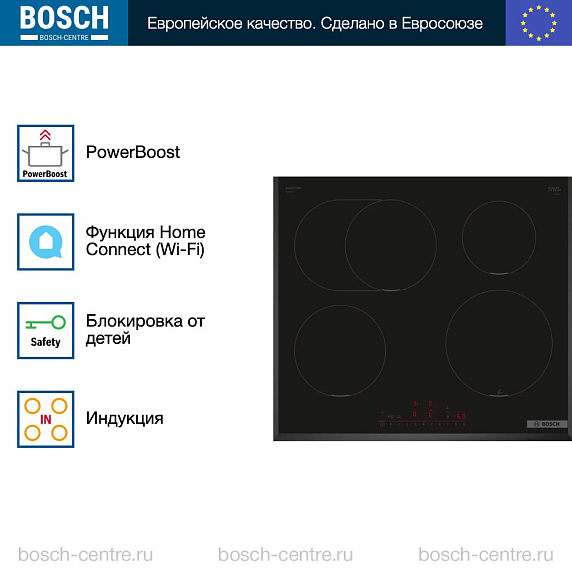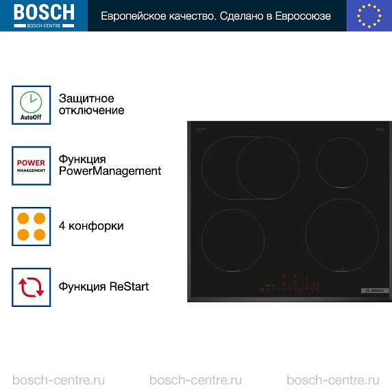 Варочная панель Bosch PIF651HC1E представляет собой современное решение для кухни, сочетающее технологичность управления с надежными системами безопасности.