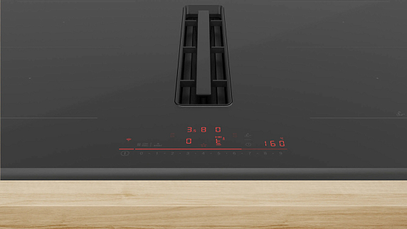 Интегрированная вытяжка расширяет функциональность: устройство поддерживает режимы отвода и рециркуляции воздуха, обеспечивая максимум производительности до 622 м3/ч, что позволяет эффективно удалять пар и запахи прямо в рабочей зоне. Режимы управления позволяют адаптировать режим работы к масштабу готовки — от тихой фоновой работы до интенсивного отведения при активном жарении. Сенсор PerfectFry с четырьмя температурными диапазонами даёт возможность устанавливать оптимальную температуру для различных кулинарных задач: от деликатного томления до быстрого обжаривания с красивой корочкой. Таймер прямого отсчёта с сигнальным оповещением и функцией отключения каждой конфорки превращает контроль процесса в интуитивный и надёжный механизм, а двухпозиционный индикатор остаточного тепла подскажет, какие зоны ещё горячие и требуют осторожности.