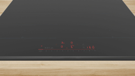 Индукционная варочная панель Bosch PXX695HC1Z изготовлена из стеклокерамики с аккуратными металлическими профилями по бокам. Небольшая высота конструкции — всего 5,1 см — позволяет сохранять минималистичный силуэт при установке, а тонкие рамки визуально расширяют рабочую поверхность. Гладкая поверхность удобна в уходе: пролитые жидкости или следы жира удаляются без усилий с помощью мягкой ткани и щадящих средств, что сохраняет первоначальный вид на длительное время. Черный цвет придаёт кухонному столу глубину и строгую эстетичность, а ровная плоскость гарантирует комфорт при размещении посуды и готовке.
