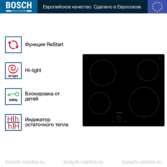 Варочная панель Bosch PKE611BA1R представляет собой практичное и надежное решение для домашней кухни, сочетающее современный дизайн с проверенной технологией Hi-Light. Устройство обеспечивает комфортное приготовление пищи при оптимальном балансе функциональности, безопасности и доступной стоимости.
