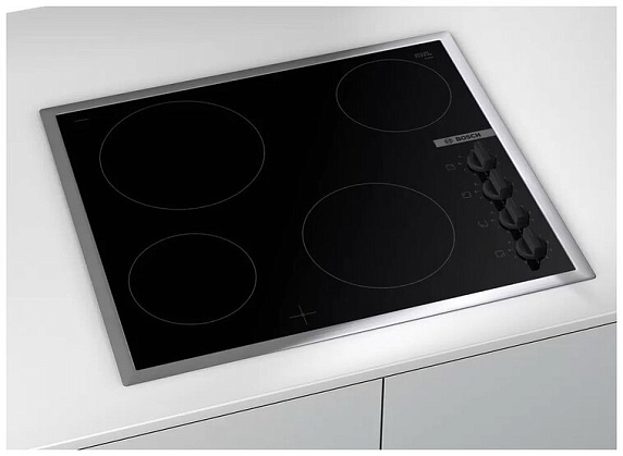 Варочная панель Bosch PKE645CA2E оснащена специальным индикатором, который показывает нагрета панель или нет. Управление осуществляется с помощью поворотных переключателей, все уровни мощности удобно расположены рядом. Поверхность модели состоит из стеклокерамики, а по бокам имеется металлическая рамка.