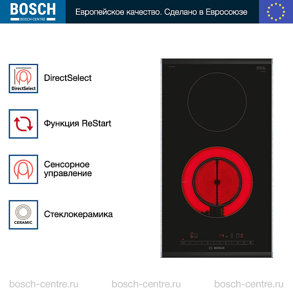 Варочная панель Bosch PKF375FP2E представляет собой уникальное сочетание инновационных технологий и стильного дизайна. Эта модель, произведенная в Евросоюзе, обладает высоким качеством и надежностью, подтвержденной 12-месячной гарантией от производителя. Стильная черная стеклокерамическая поверхность с скошенным краем и рамкой из нержавеющей стали не только придает устройству элегантность, но и обеспечивает простоту в уходе.