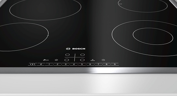 Чёрная стеклокерамическая поверхность Бош PKF645FP1G выглядит эффектно и современно, не боится перепадов температур и характеризуется высокой прочностью. Рамка из нержавеющей стали выполняет защитную функцию.