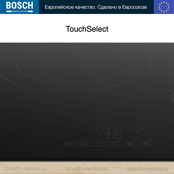 Поверхность относится к типу Hi-Light и позволяет точно регулировать нагрев — всего предусмотрено 17 ступеней мощности. Сенсорная панель TouchSelect делает управление интуитивным: легко задать уровень нагрева, выбрать время работы и использовать таймер с автоотключением для каждой зоны отдельно.