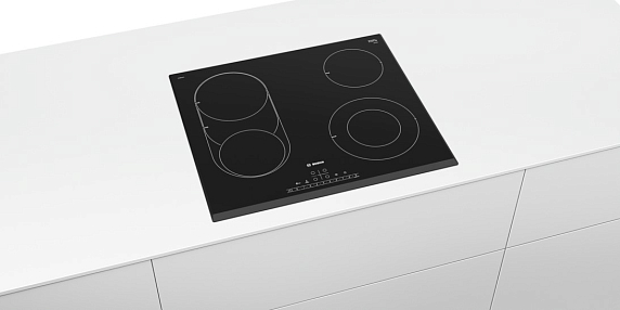 Электрическая варочная панель Bosch PKM651FP1 со скошенным краем предусматривает приготовление пищи на расширенной варочной зоне овальной формы: можно использовать казан или утятницу.