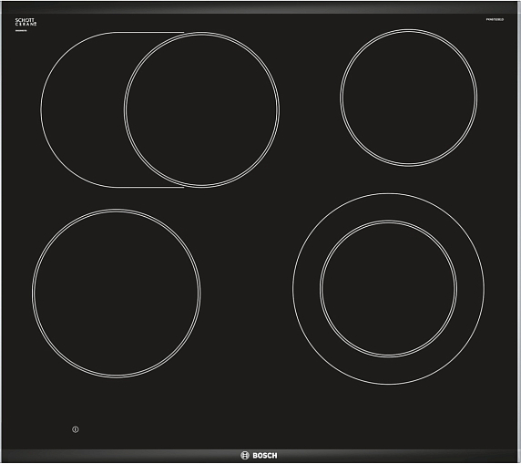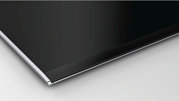 Варочная панель Bosch PKN675DB1D — встраиваемая электрическая модель с независимым управлением. Поверхность из стеклокерамики с двух сторон отделана тонкой полоской нержавеющей стали, сверху и снизу лист скошен и плотно прилегает к столешнице.