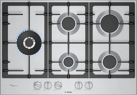 Газовая варочная панель Bosch PCS7A5I90 имеет пять конфорок с разноуровневой мощностью, суммарная мощность которых достигает 12.5 кВт: левая зона с WOK-конфоркой мощностью 5 кВт обеспечивает интенсивный нагрев для больших сковород и литых посуд, задняя правая — 3 кВт, передние и задние боковые зоны — от 1 до 1.75 кВт, что даёт широкий диапазон регулировок и позволяет одновременно готовить разнообразные блюда. Пять зон сочетаются с девятью ступенями мощности, благодаря чему можно точно подбирать интенсивность нагрева для тушения, кипячения, жарки и медленного томления. Такая конфигурация пригодится при готовке больших трапез и при необходимости одновременно использовать несколько ёмкостей различных объёмов.